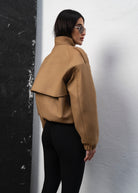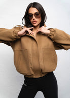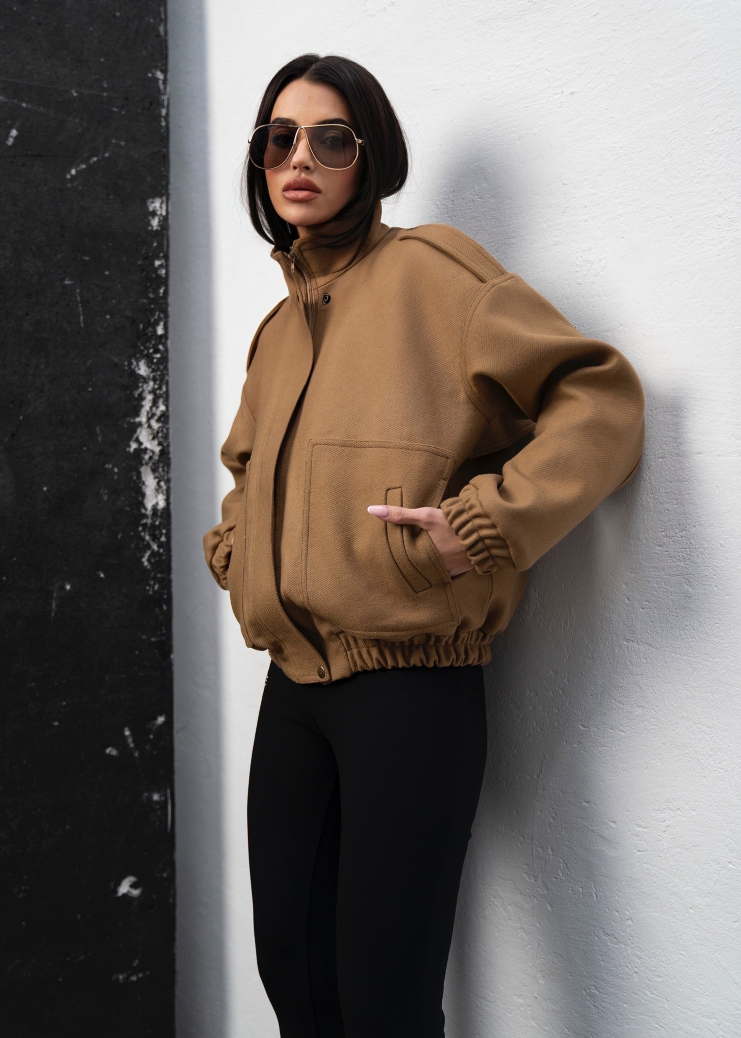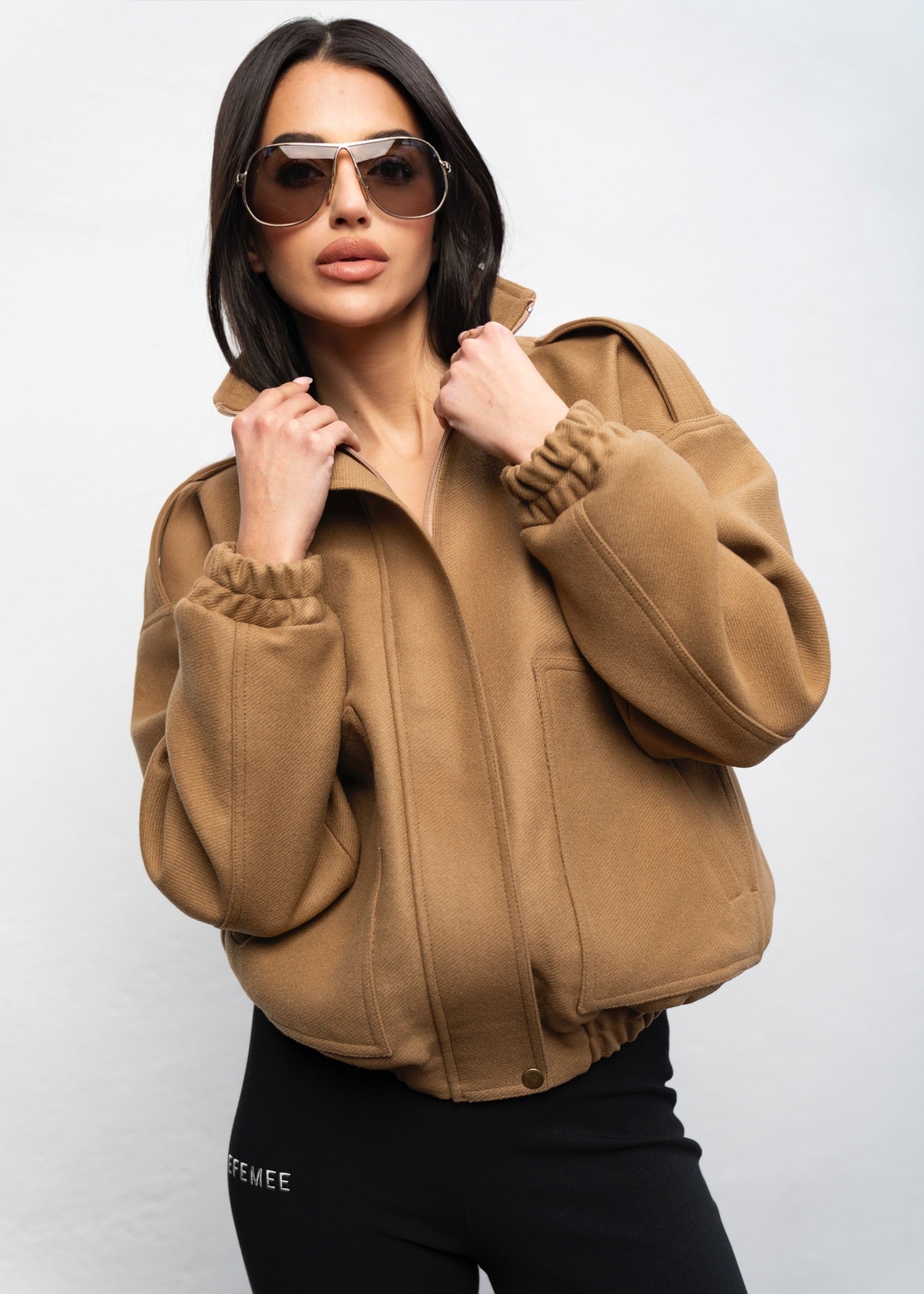Krótka kurtka typu bomber o wyraźnie zaznaczonej formie i dopracowanych detalach.