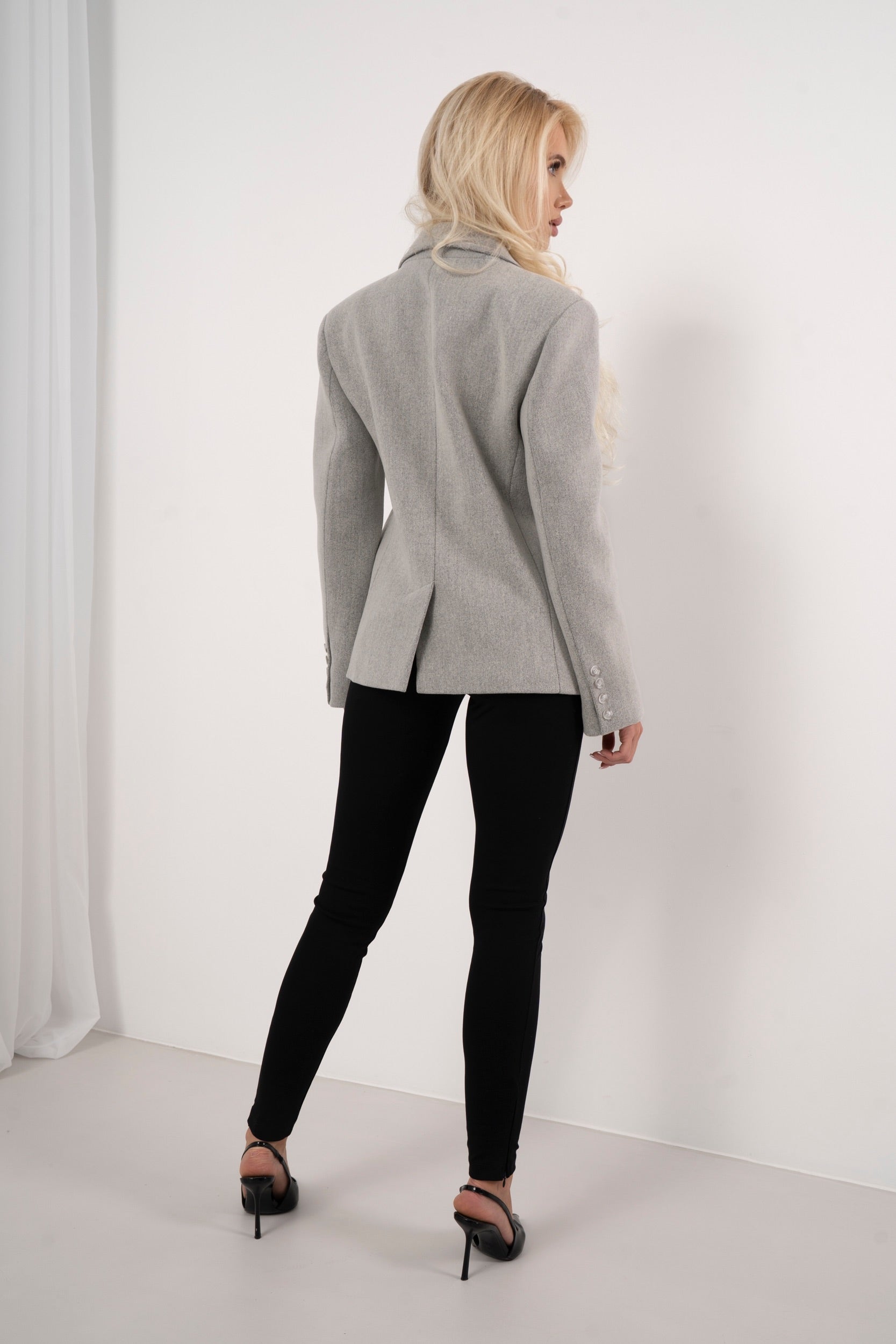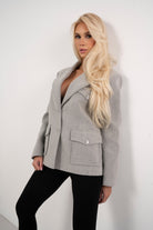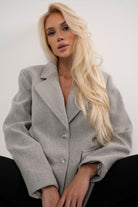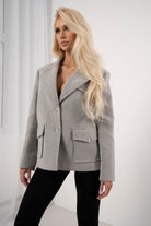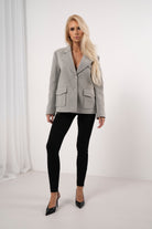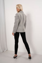 Stylowa marynarka w eleganckim, ponadczasowym kroju, który doskonale podkreśla sylwetkę. Model wykonany z wysokiej jakości materiału, z klasycznym kołnierzem oraz praktycznymi kieszeniami z klapami. Neutralny szary kolor sprawia, że marynarka świetnie sprawdzi się zarówno w eleganckich stylizacjach, jak i w codziennych zestawach z jeansami czy dopasowanymi spodniami. Idealny wybór dla kobiet ceniących styl, wygodę i uniwersalną elegancję.