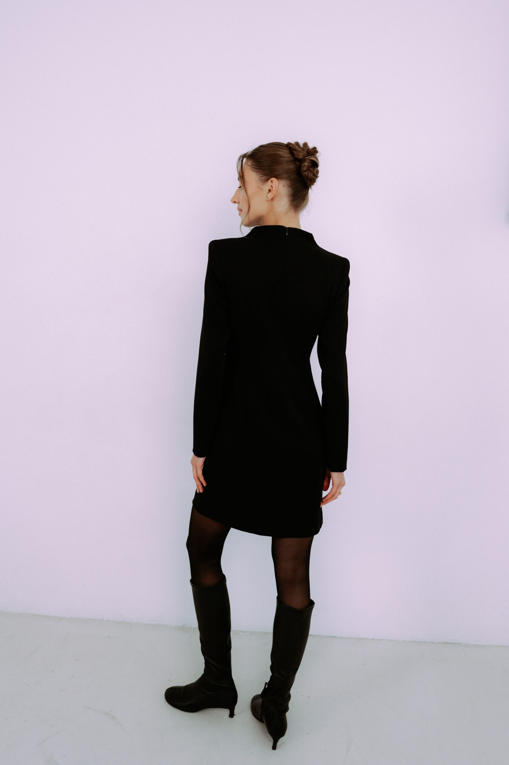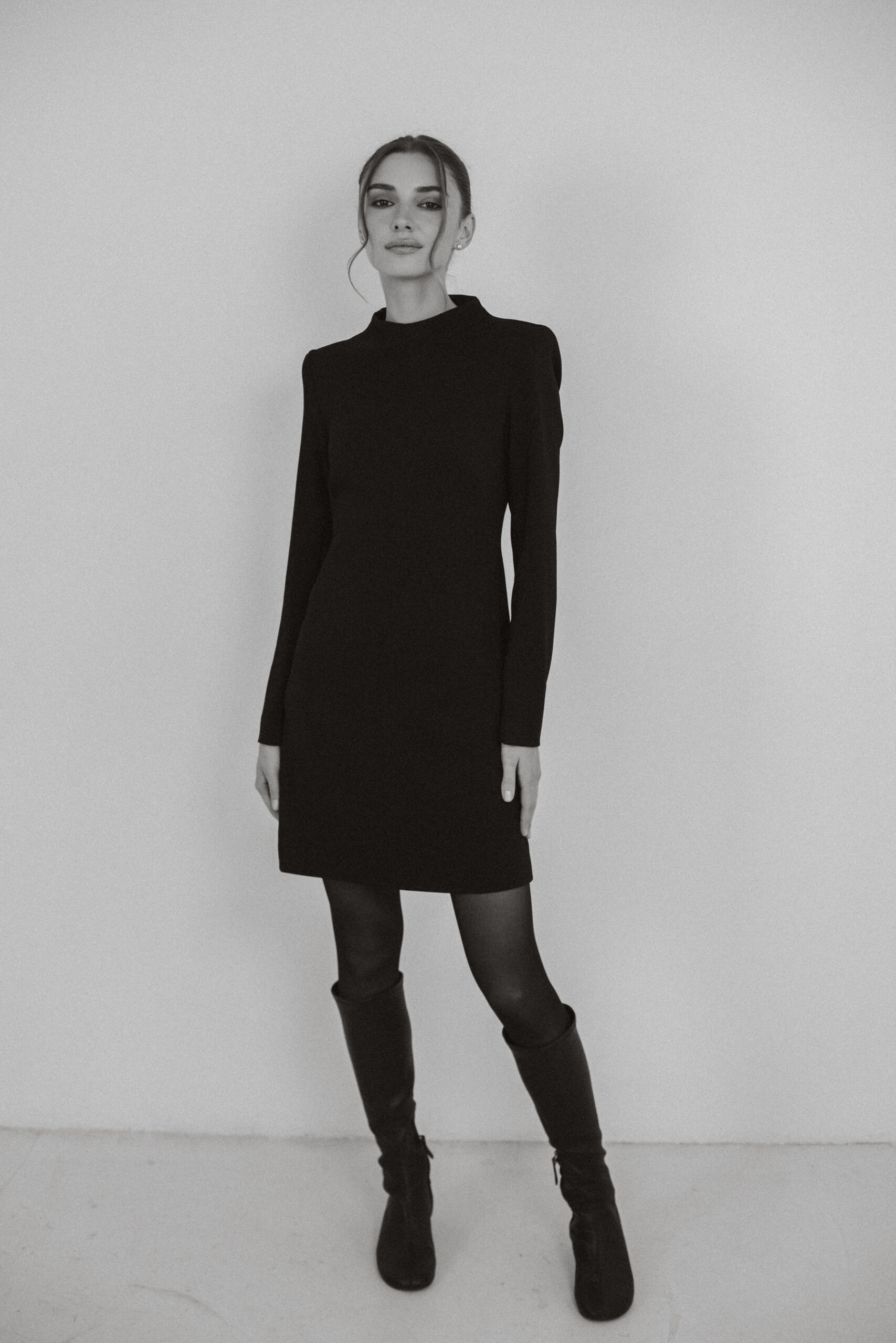 Sukienka w kolorze czarnym o prostym kroju z mini golfikiem przy szyi i poduszkami w ramionach, wykonana z wiskozy z dodatkiem elastanu. Posiada klasyczny, ale wyróżniający się krój, długi rękaw, długość przed kolano. Z tyłu na plecach zamek ułatwiający zakładanie. Sukienka Aura to idealny wybór na wiele okazji, kiedy chcesz czuć się wyjątkowo.
